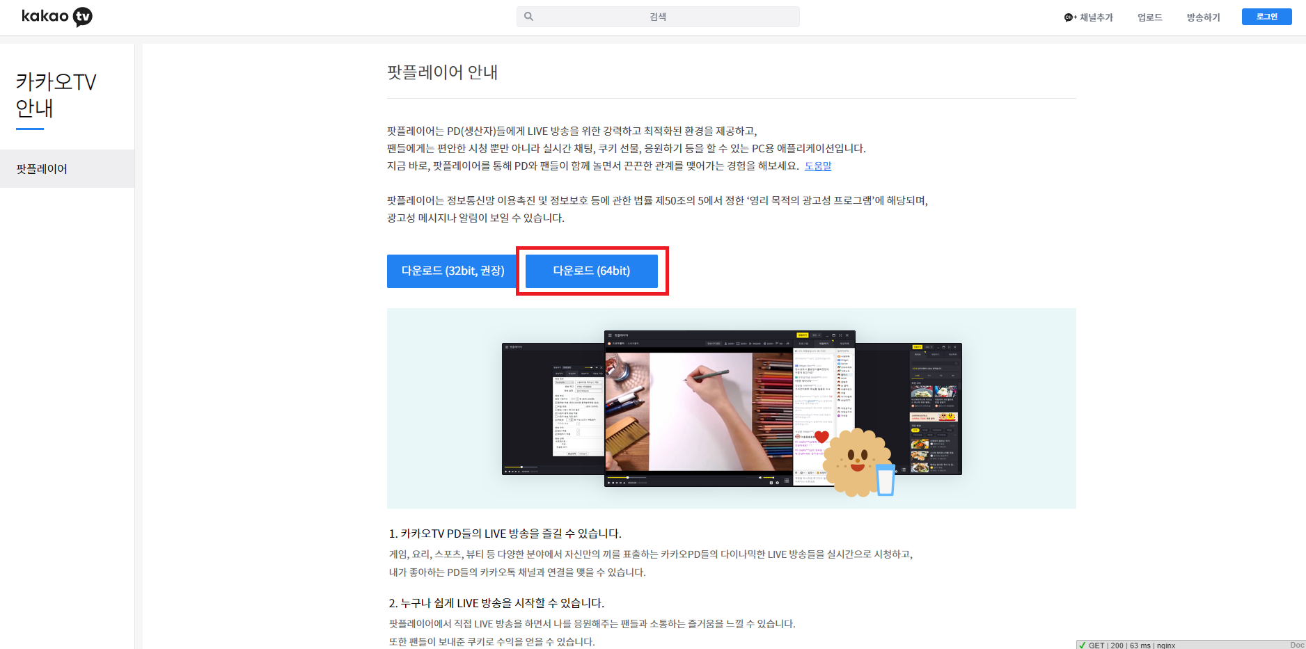 9. 위 링크로 들어가면 위 사진 처럼 Kakao TV의 팟플레이어 다운로드 페이지로 들어가집니다.