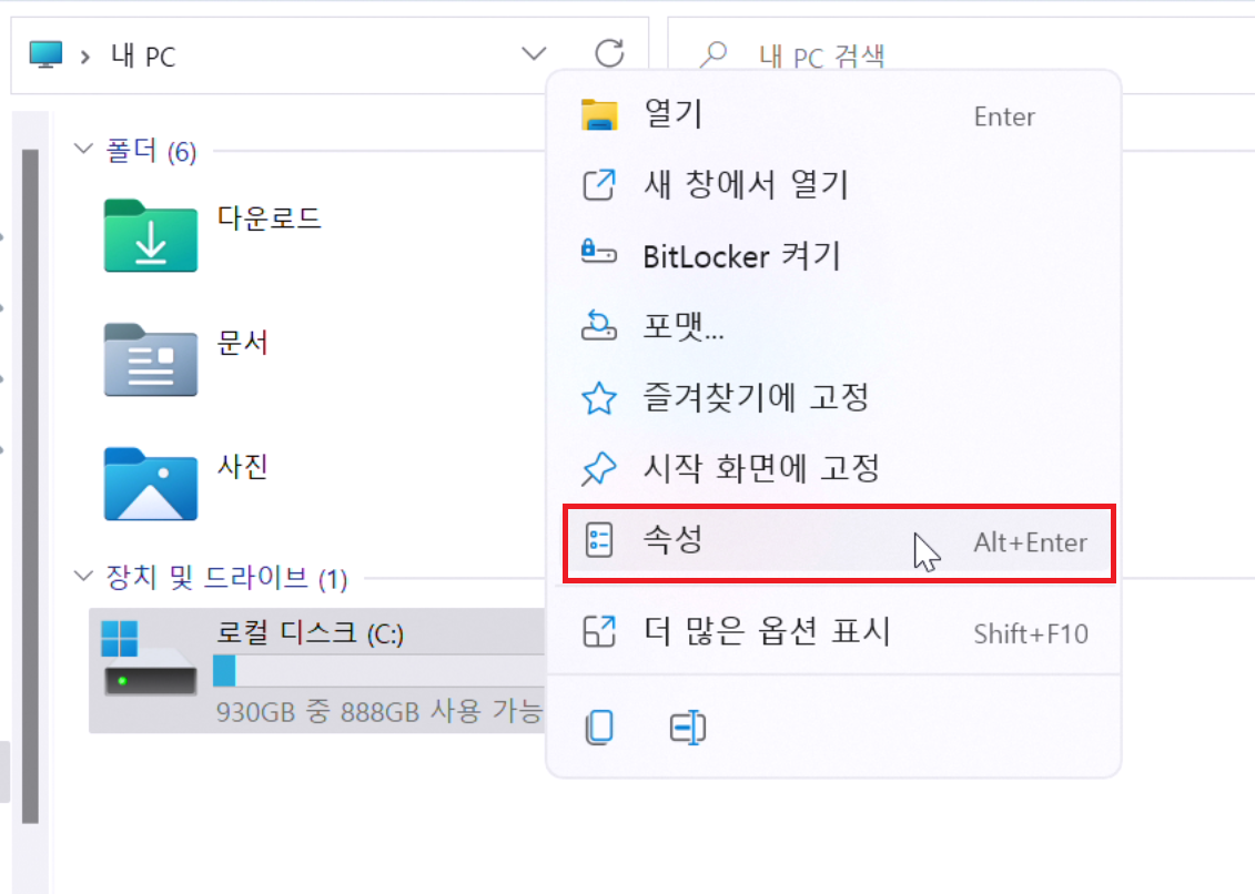 속성을 눌러 C드라이브 디스크 속성을 확인해줍시다.