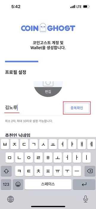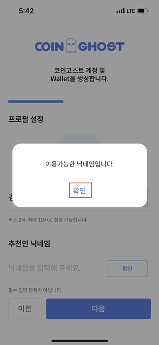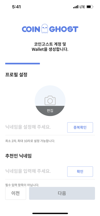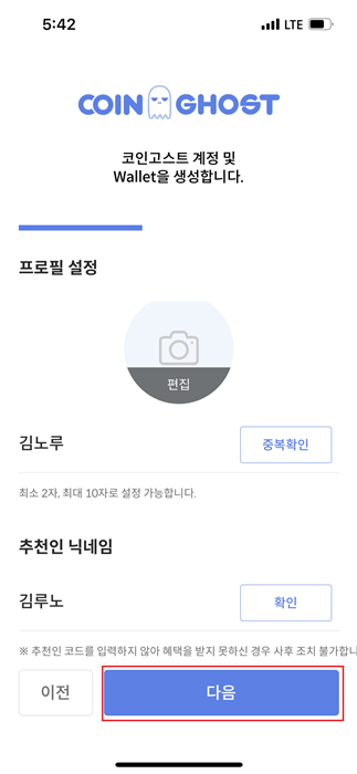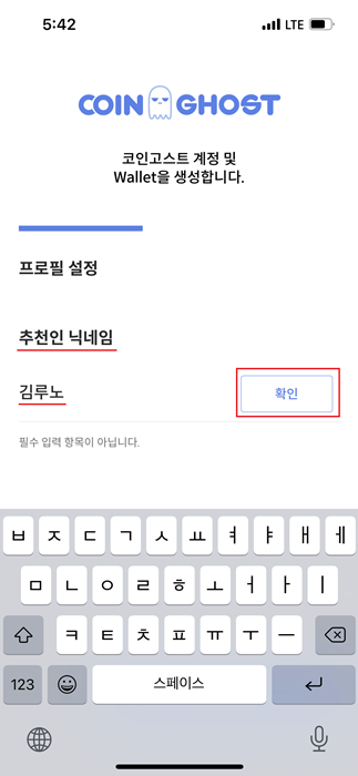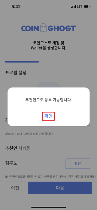 코인고스트 내에서 사용할 닉네임과 해당 어플 가입 시 추천인을 등록할 수 있습니다.