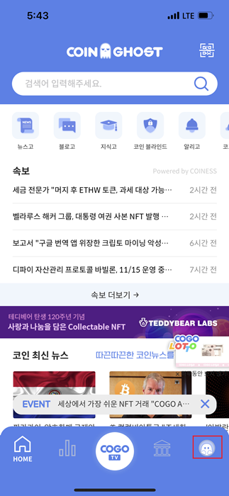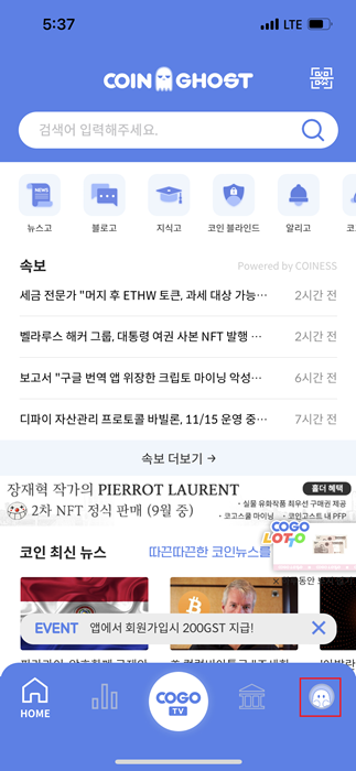 코인고스트는 뉴스, 시세차트, 상장정보, 이벤트정보 및 COGO TV라는 컨텐츠를 가지고 사용자들에게 지식 제공 및 지식 공유를 하는 포털 사이트 입니다.