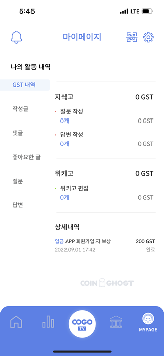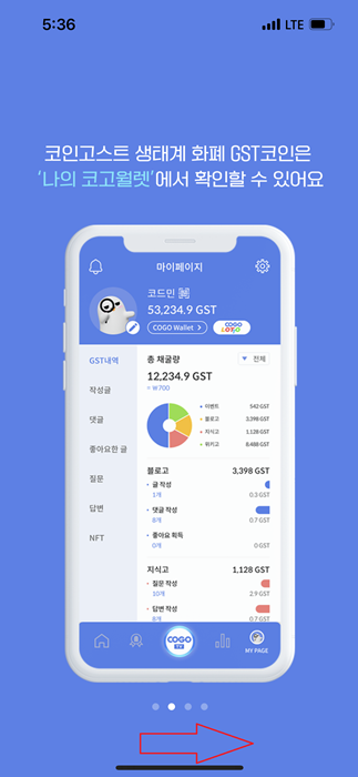 35. 마이페이지로 들어오면 위와 같이 회원정보와 보유 GST를 확인할 수 있습니다.