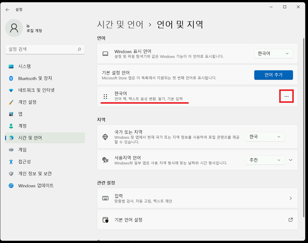 4. 언어 및 지역으로 들어오시면 한국어로 설치한 윈도우라면
