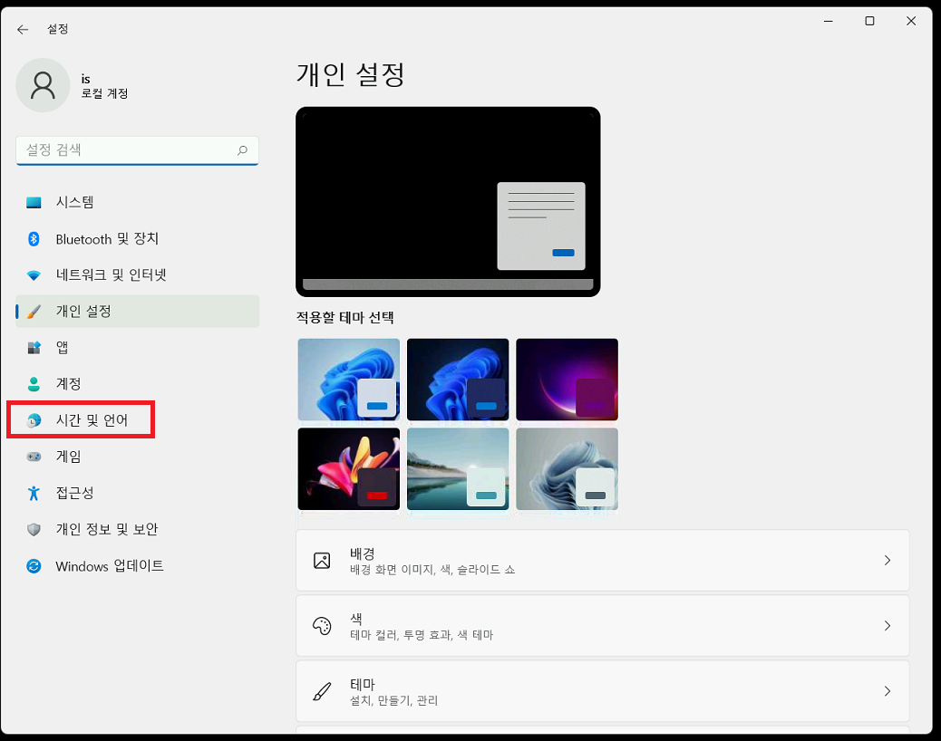 왼쪽 메뉴에서 시간 및 언어로 들어가줍시다.