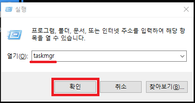 10. 작업관리자를 띄우기 위해 taskmgr을 입력하고 확인을 눌러줍시다.