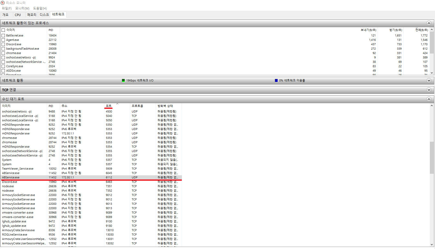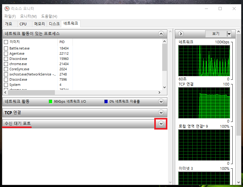5. 수신대기 포트를 더 자세히 확인하기 위해 리소스 모니터 창을 최대화 해줍시다.