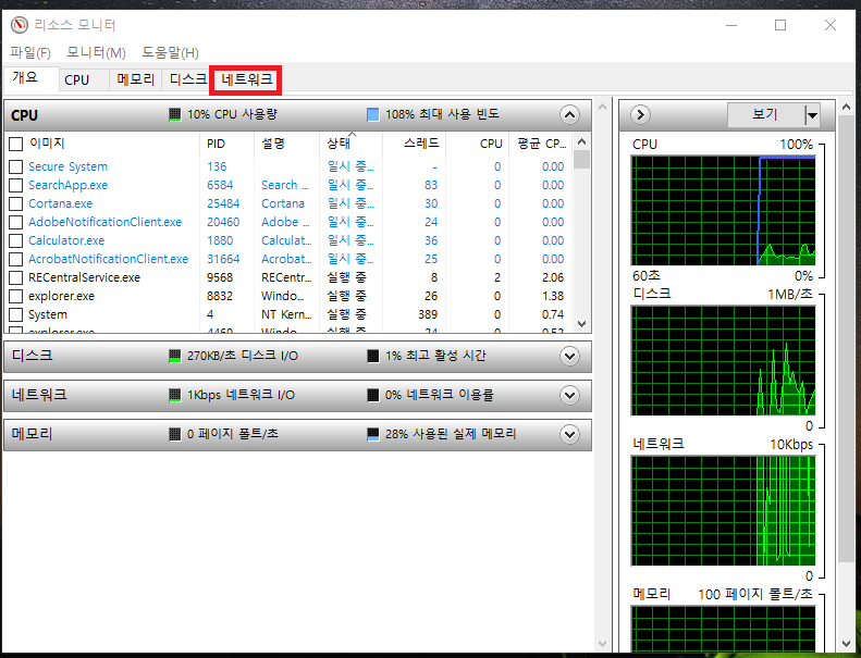 3. 리소스 모니터 창이 뜨면 네트워크 탭으로 들어가줍시다.