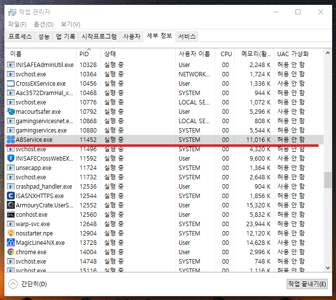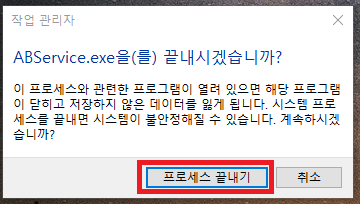 14. ABService.exe가 보입니다. 해당 프로세스에 마우스 우클릭하여 종료해줍시다.