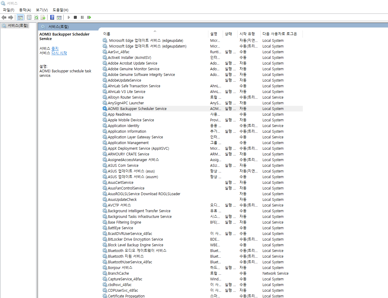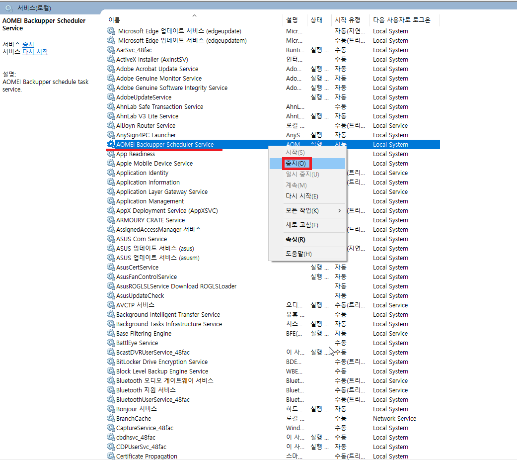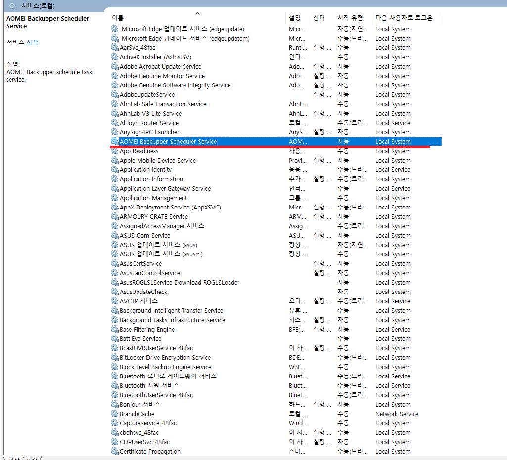 18. 윈도우 서비스 창으로 들어가서 AOMEI BACKUPPER SCHEDULER SERVICE를 찾아줍시다.