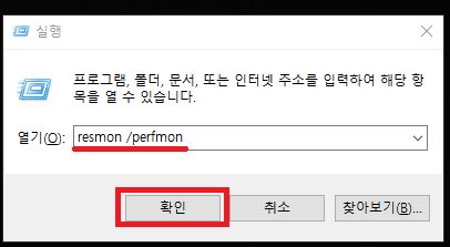 2. 리소스 모니터를 열기 위해 resmon /perfmon 을 입력하고 확인을 눌러줍시다.