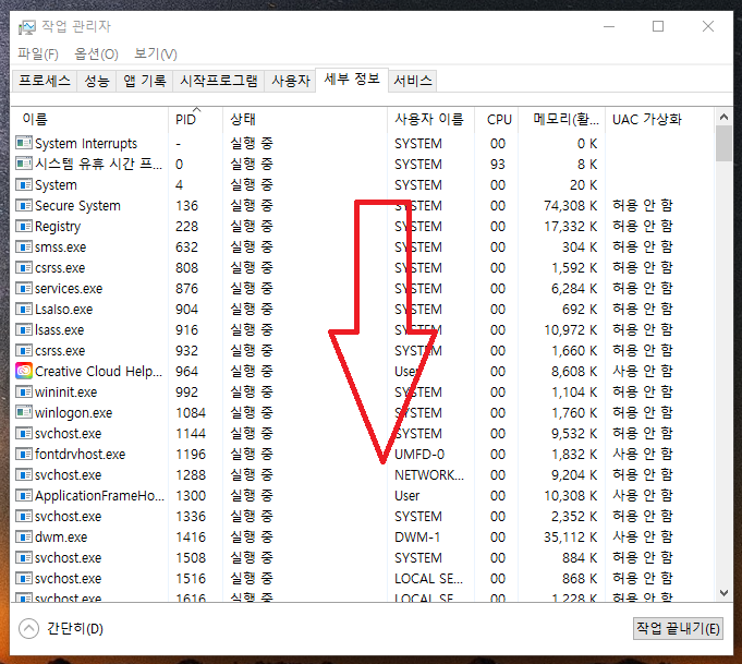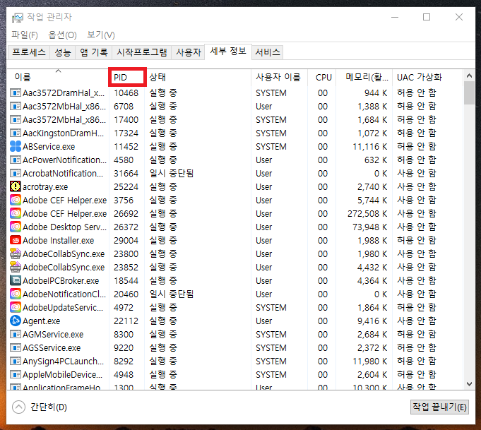12. 세부정보 탭으로 왔으면 PID 를 눌러서 오름차순 정렬을 해줍시다.