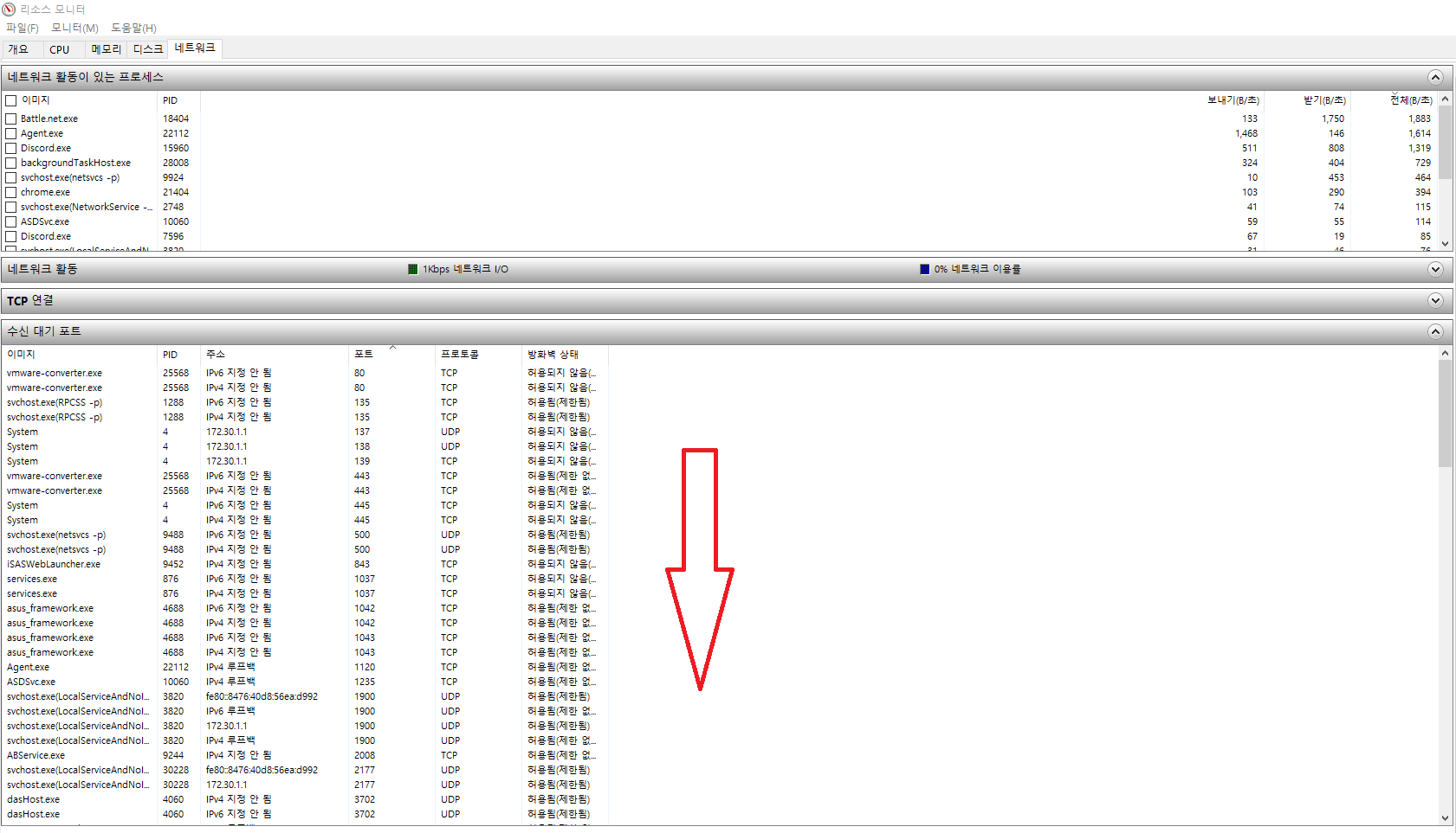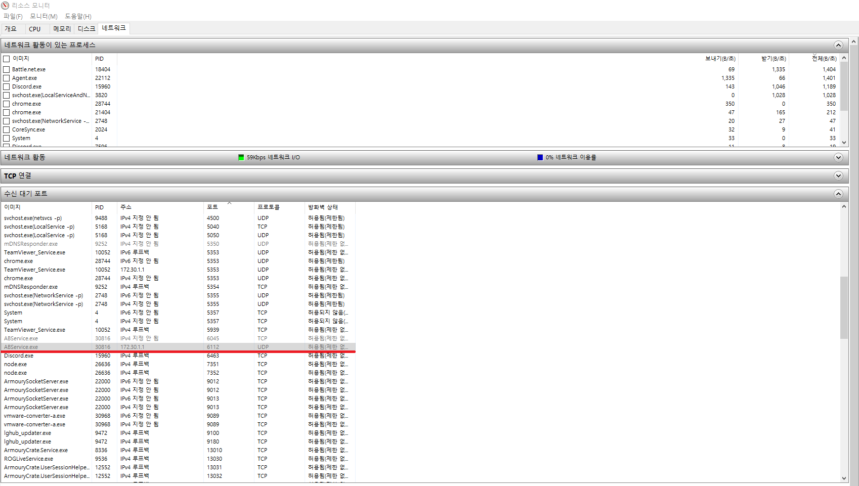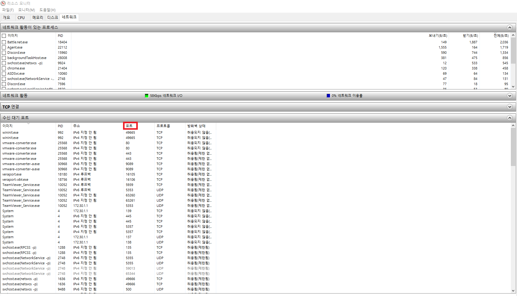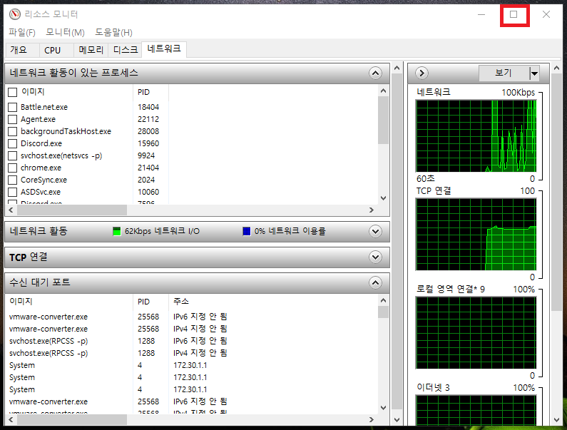 5. 수신대기 포트를 더 자세히 확인하기 위해 리소스 모니터 창을 최대화 해줍시다.