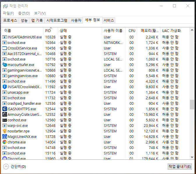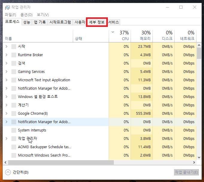 11. 작업관리자가 뜨셨으면 세부 정보 탭으로 들어가서 프로세스를 확인해줍시다.