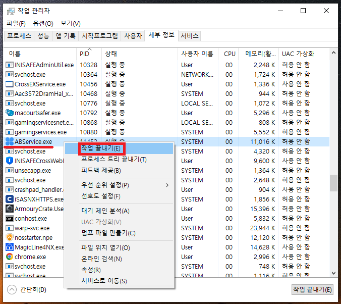 14. ABService.exe가 보입니다. 해당 프로세스에 마우스 우클릭하여 종료해줍시다.
