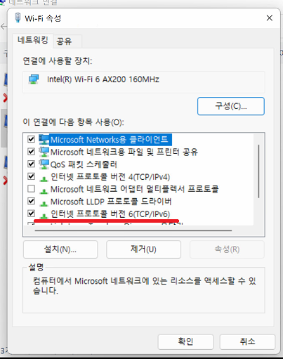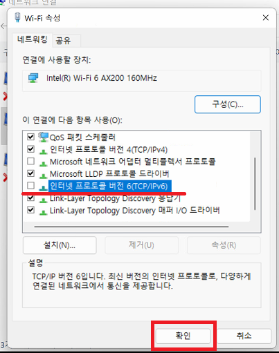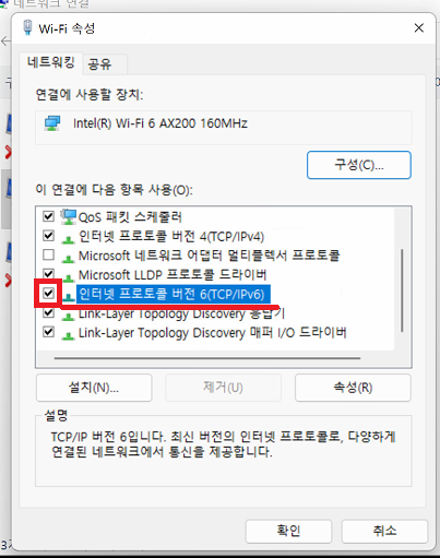 인터넷 프로토콜 버전 6(TCP/IPv6)를 찾아줍시다.