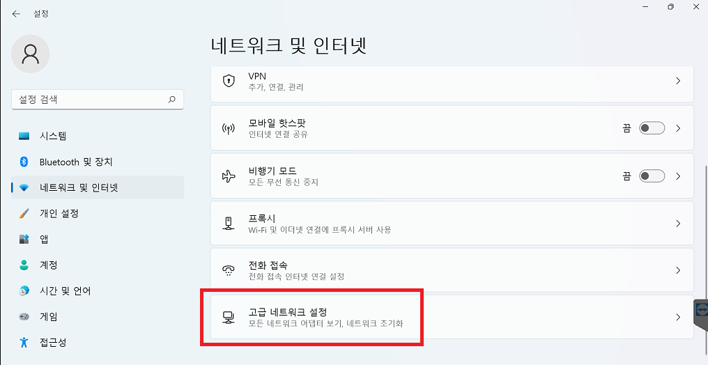 5. 스크롤을 내리다보면 고급 네트워크 설정이 있습니다.