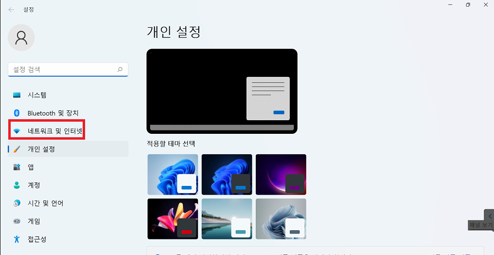 3. 개인 설정 창이 뜨면 왼쪽 메뉴에서 네트워크 및 인터넷을 찾아 들어가줍시다.