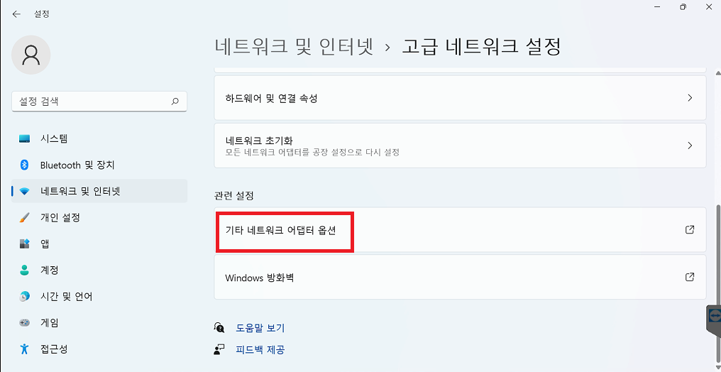 기타 네트워크 어댑터 옵션으로 들어가기 위해