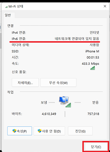아이폰 핫스팟 테더링 연결 시 IPv6 로 통신하는 문제 해결을 위해 네트워크 어댑터에서 IPv6 비활성화 하기