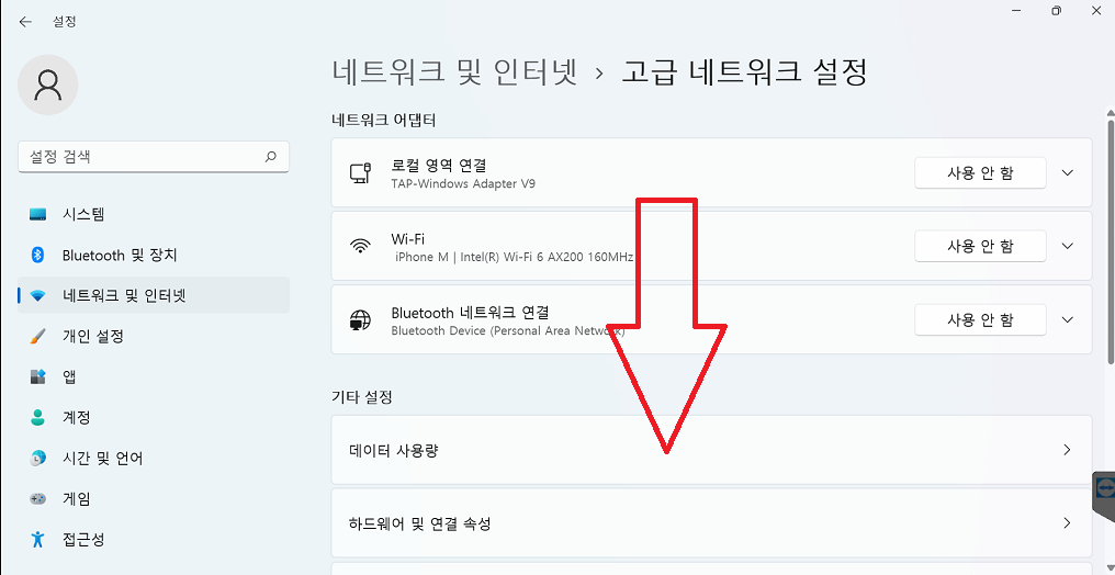 4. 네트워크 및 인터넷 탭으로 들어오면 고급 네트워크 설정을 찾기 위해 스크롤을 아래로 내려줍시다.
