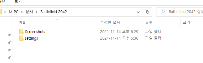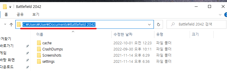 1. 경로 C:\Users\유저이름\Documents\Battlefield 2042\ 폴더로 접속합니다.