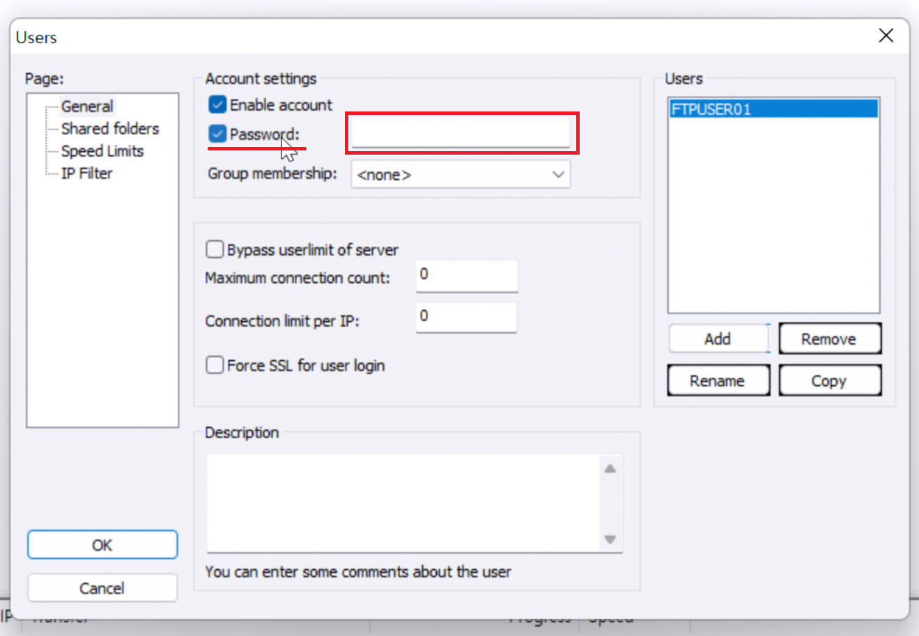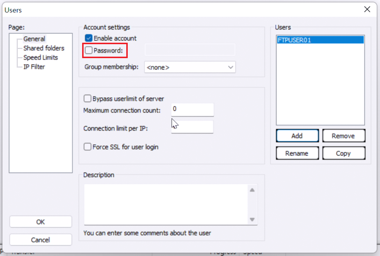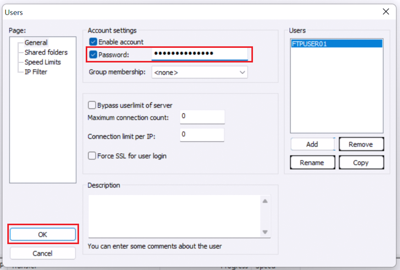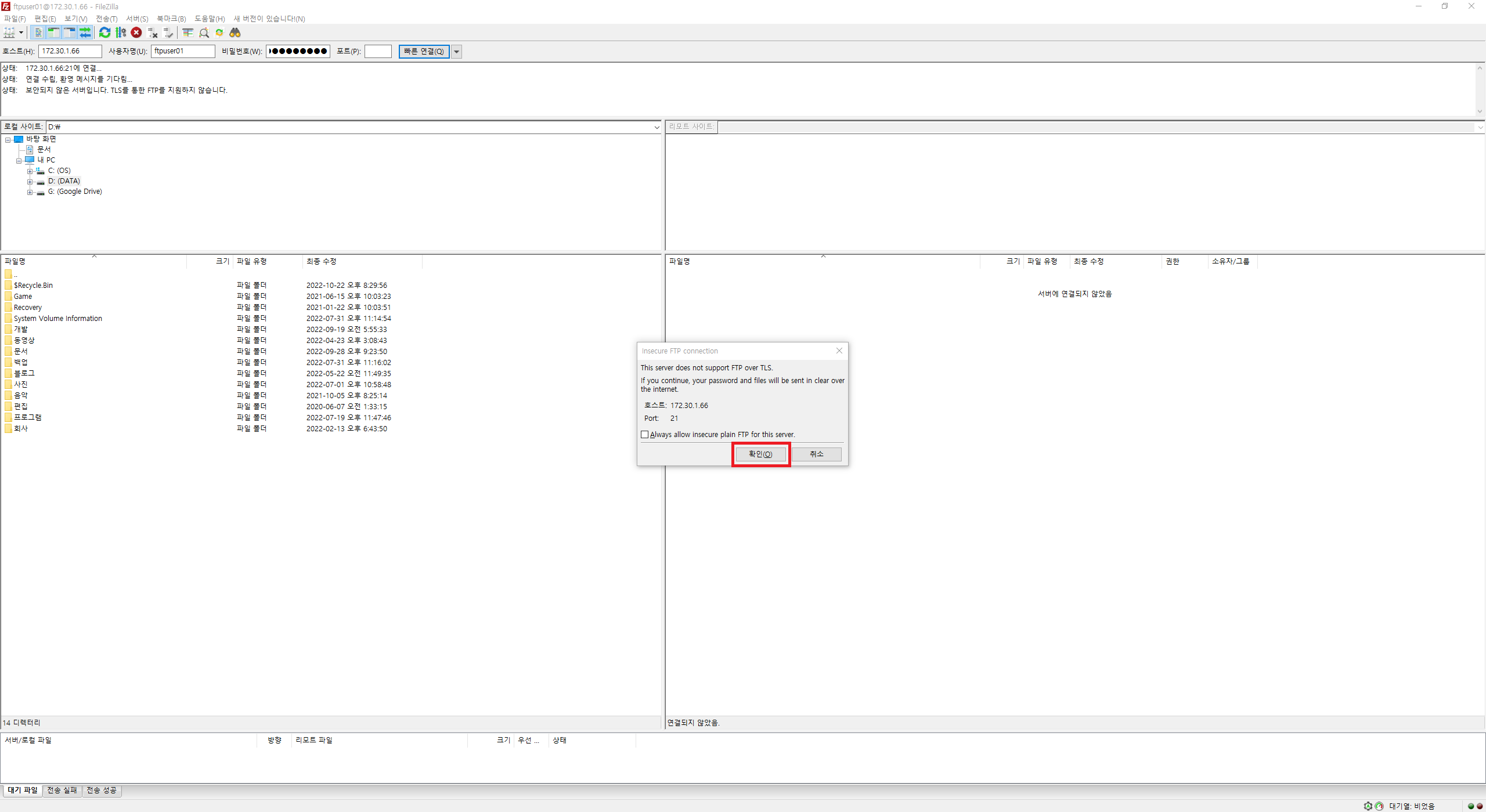 비밀번호에는 아까 설정한 FTP사용자의 비밀번호를 넣어줍시다.