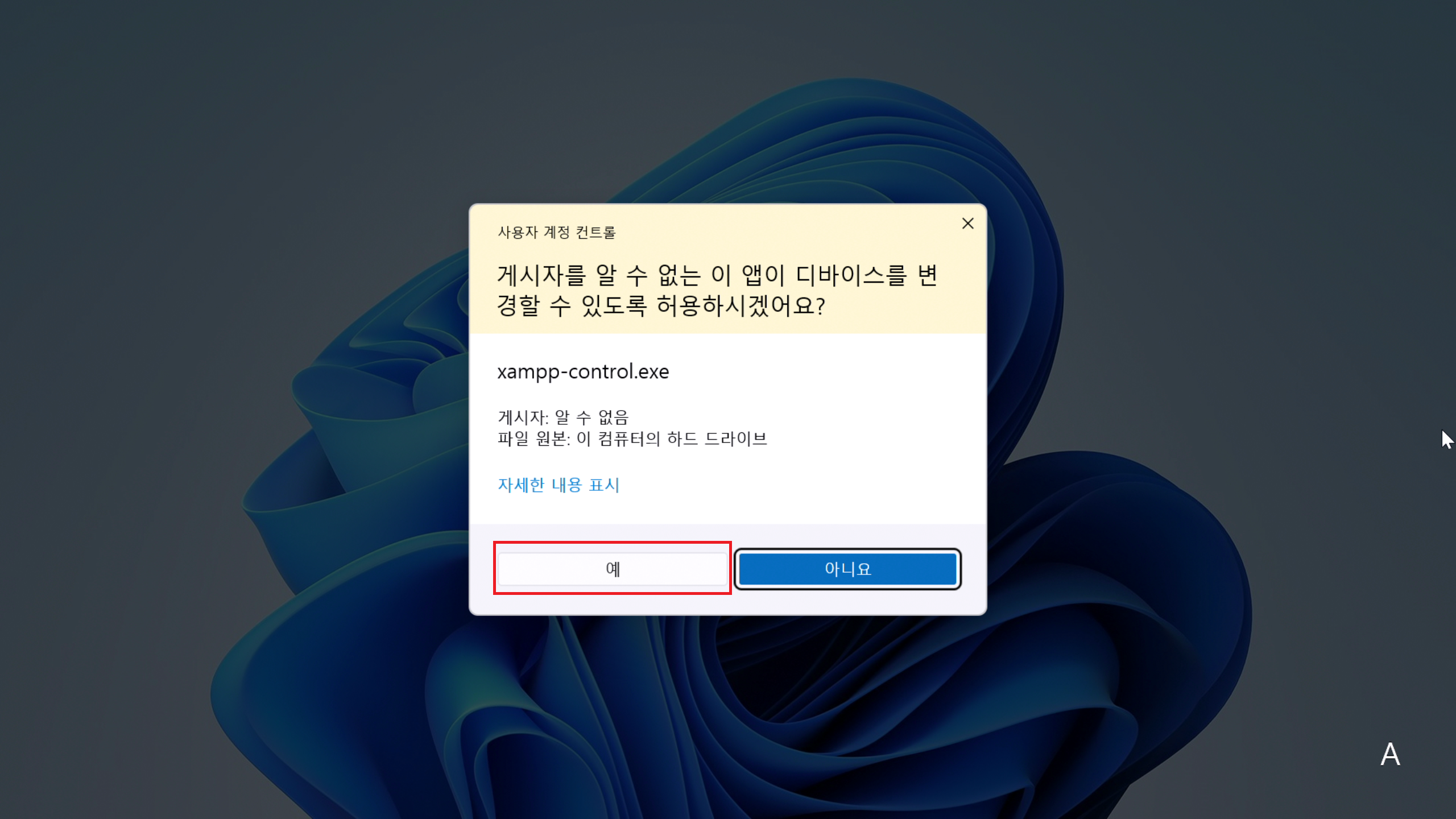 2. 사용자 계정 컨트롤 메시지가 뜨면 예를 눌러줍시다.