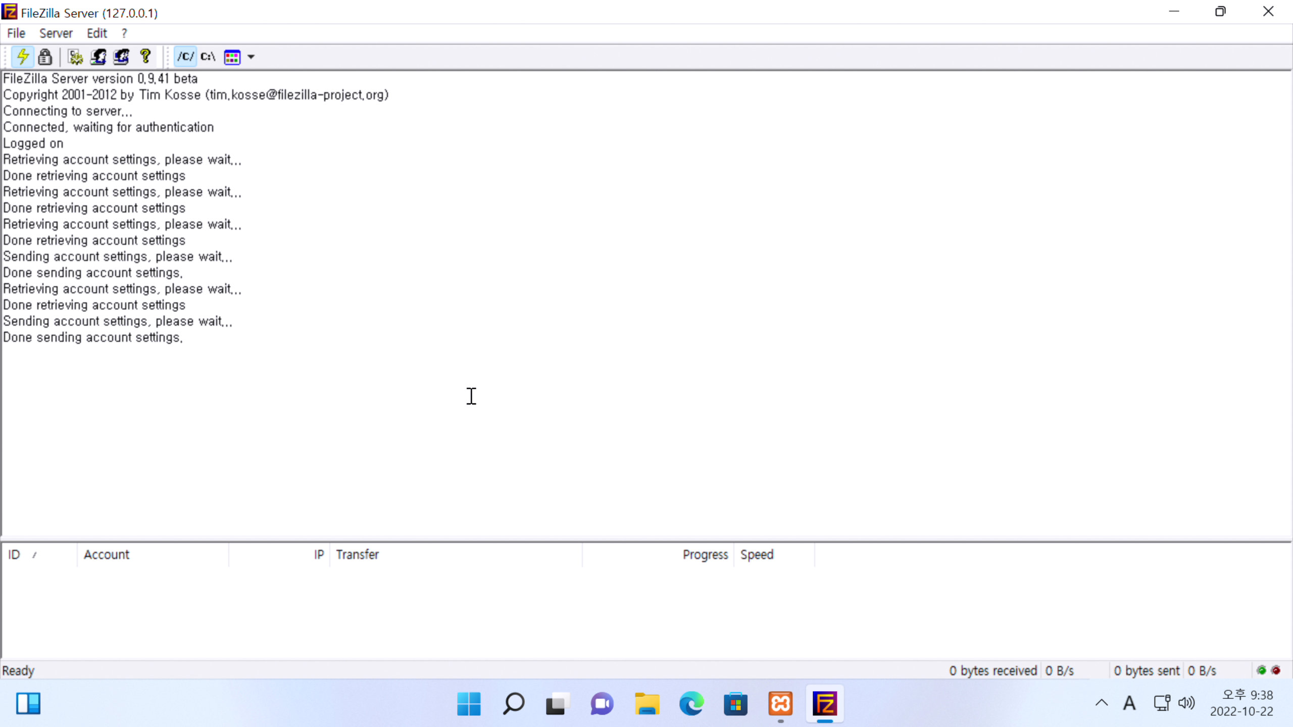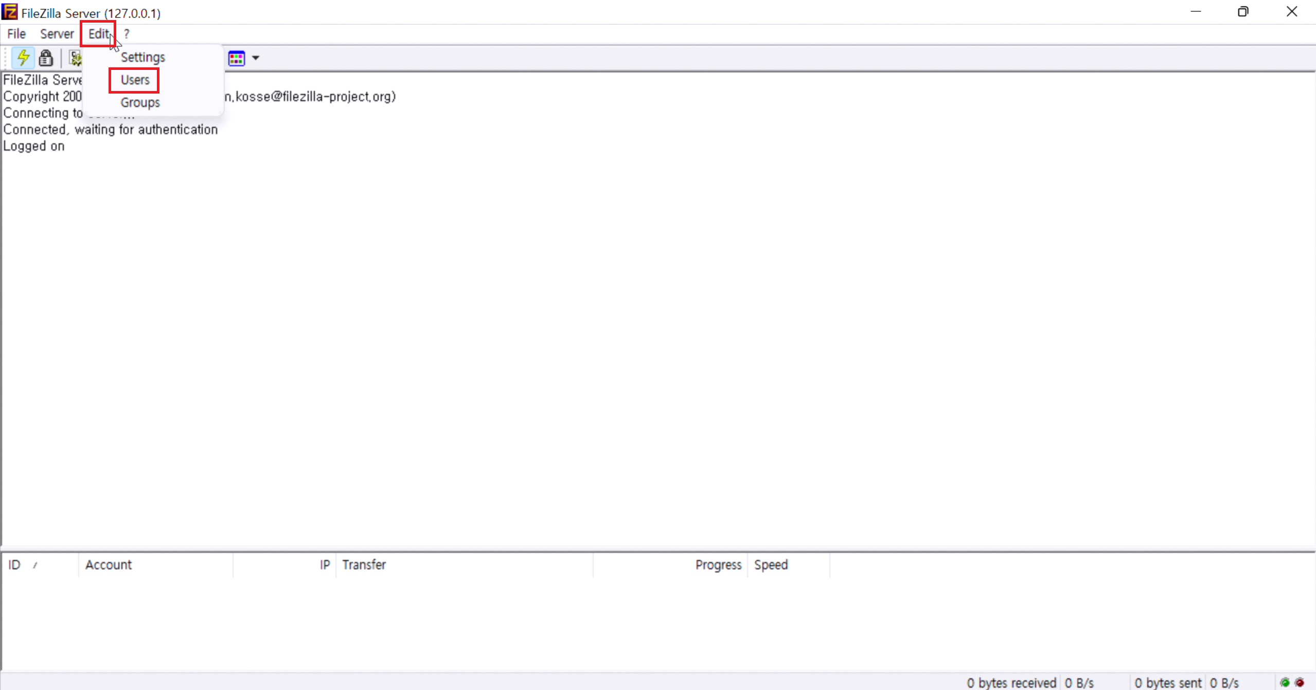 5. FileZilla Server 창이 위와 같이 뜨셨다면 상단 메뉴 탭 Edit를 눌러줍시다.