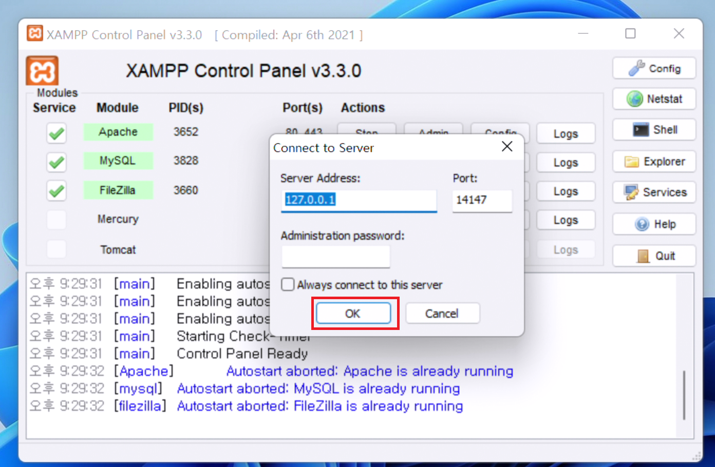 4. 위와 같이 Connect to Server 창이 뜨면 자동으로 입력된 값을 두고 OK를 눌러줍시다.