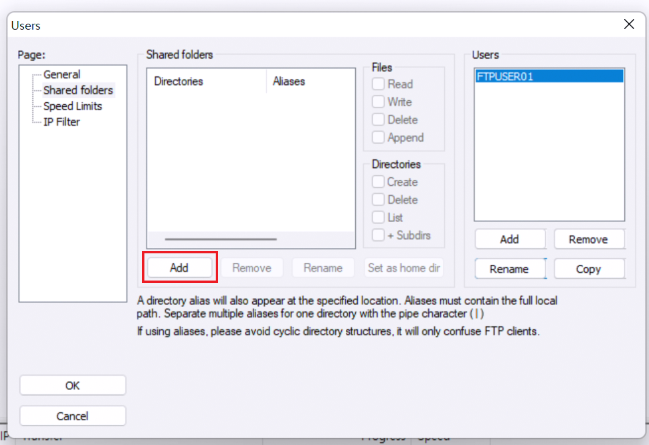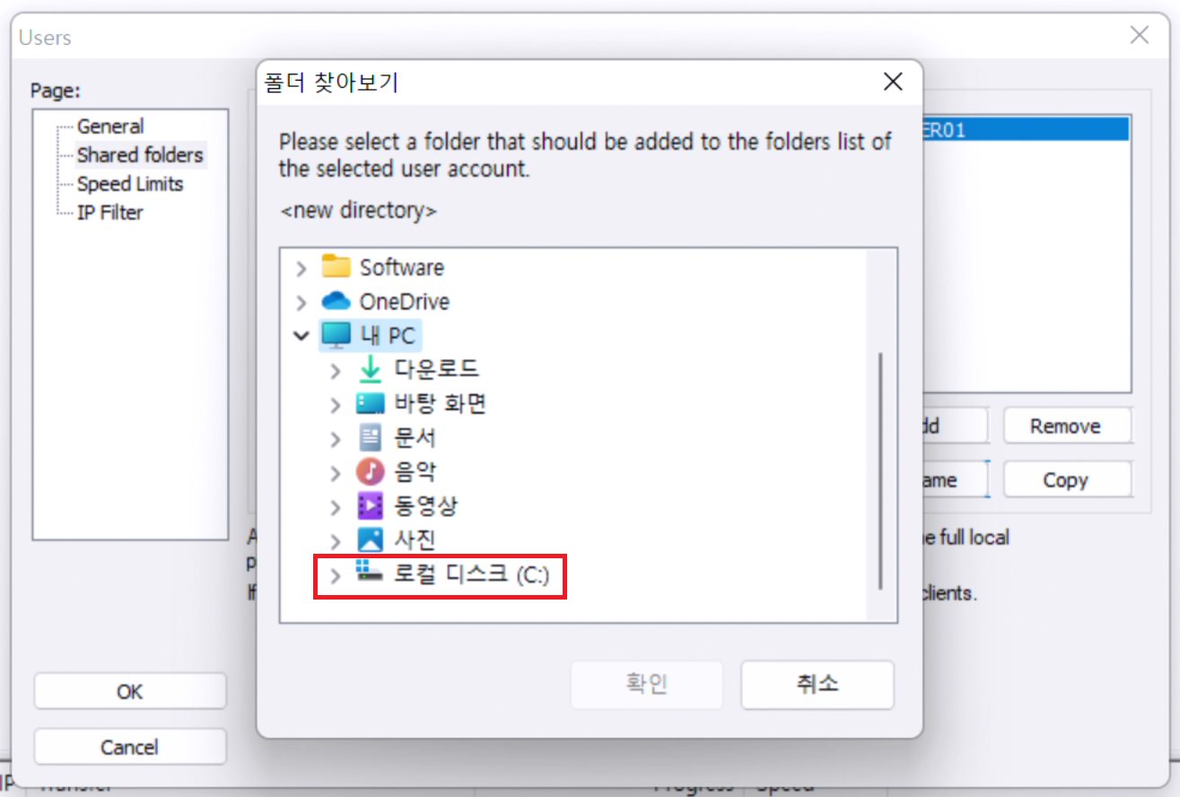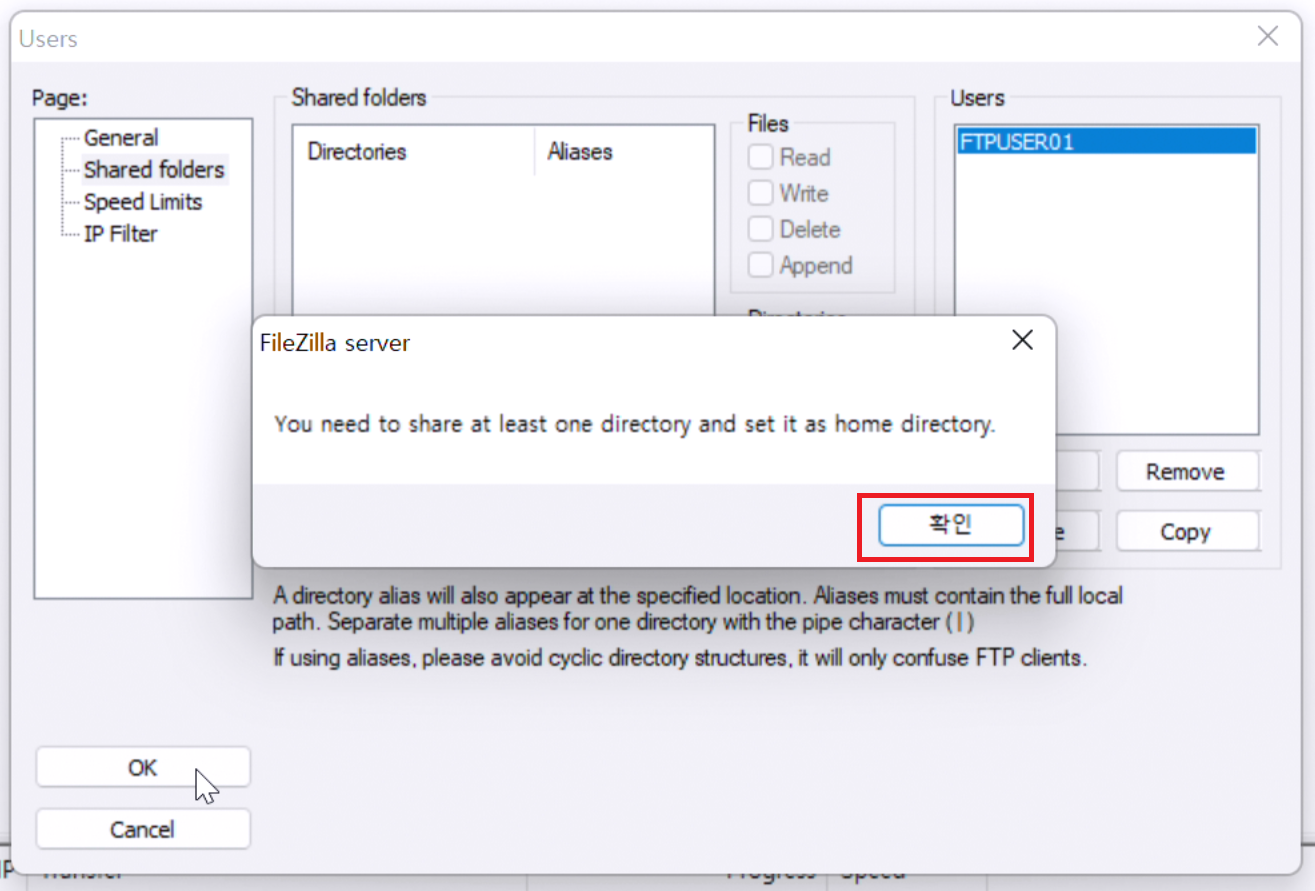 FTPUSER01이 계정으로 해당 폴더에 대한 사용권한을 지급해야만