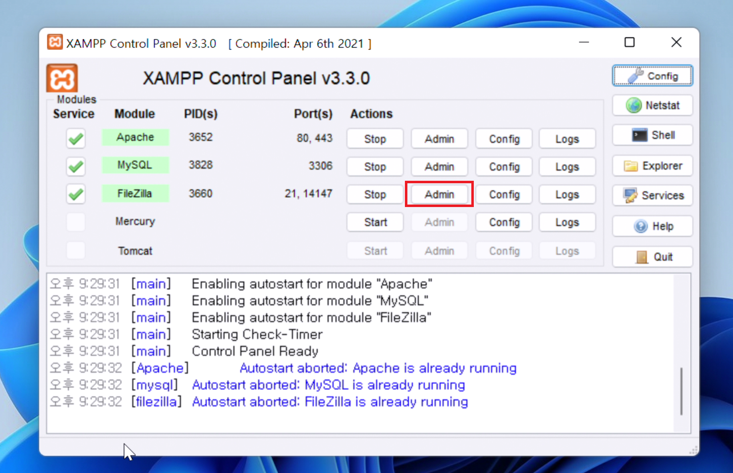3. XAMPP 컨트롤 패널이 뜨셨다면 FileZilla 항목의 Actions 버튼 중 Admin 버튼을 눌러줍시다.