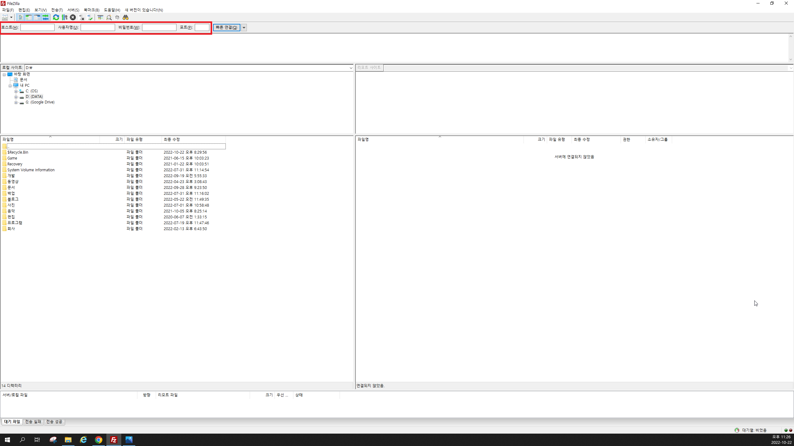 FileZilla Client를 설치하고 프로그램을 실행하면 위와 같이 프로그램이 뜹니다.