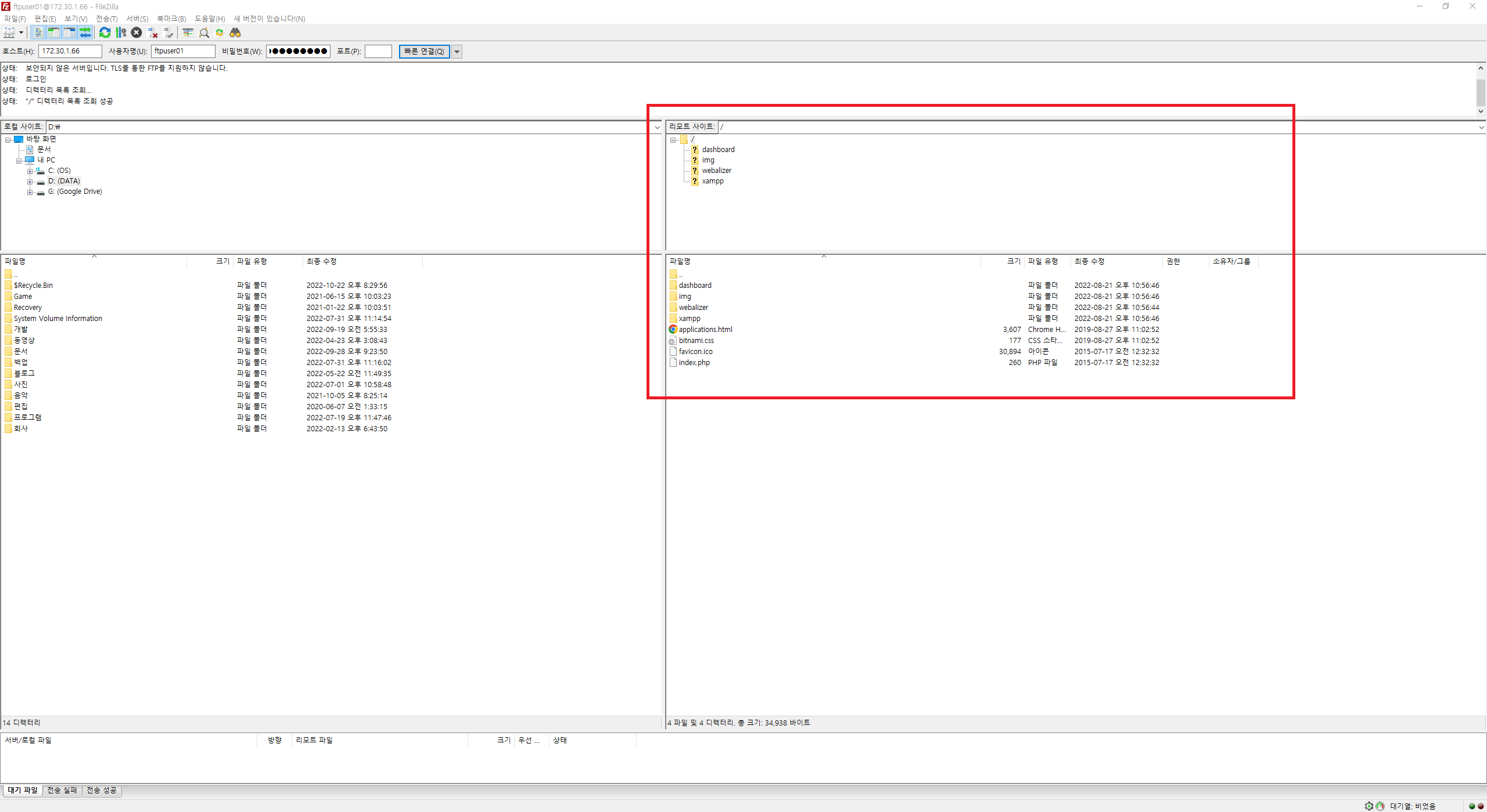 만약 접속되지 않으면 우측에 파일들이 안 보이실겁니다.