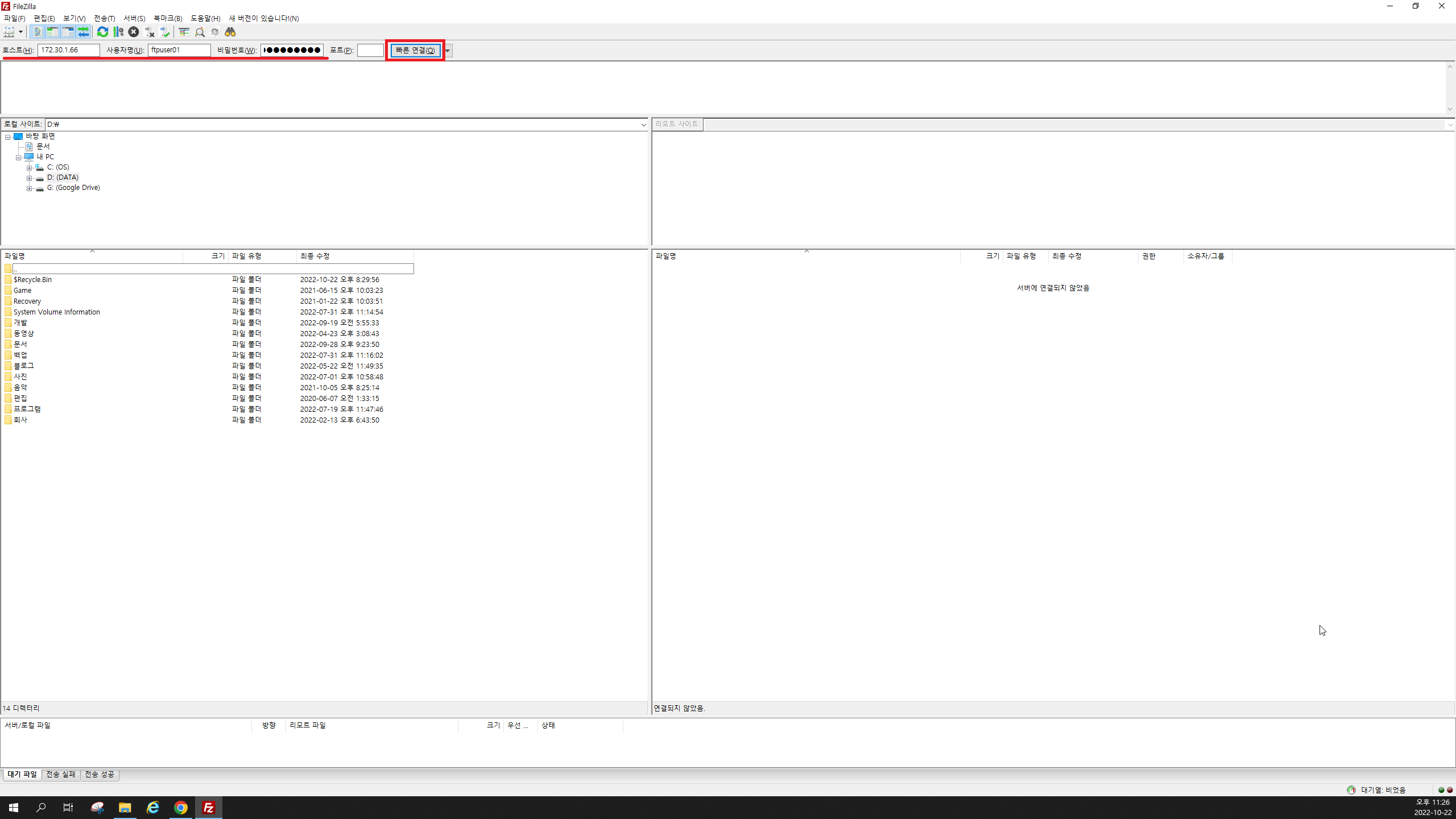 22. 호스트, 사용자명, 비밀번호에 값을 입력하고 빠른 연결을 눌러줍시다.