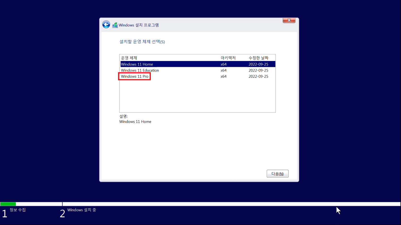 7. Windows 11 Pro를 선택하셨다면 다음을 눌러 진행해줍시다.