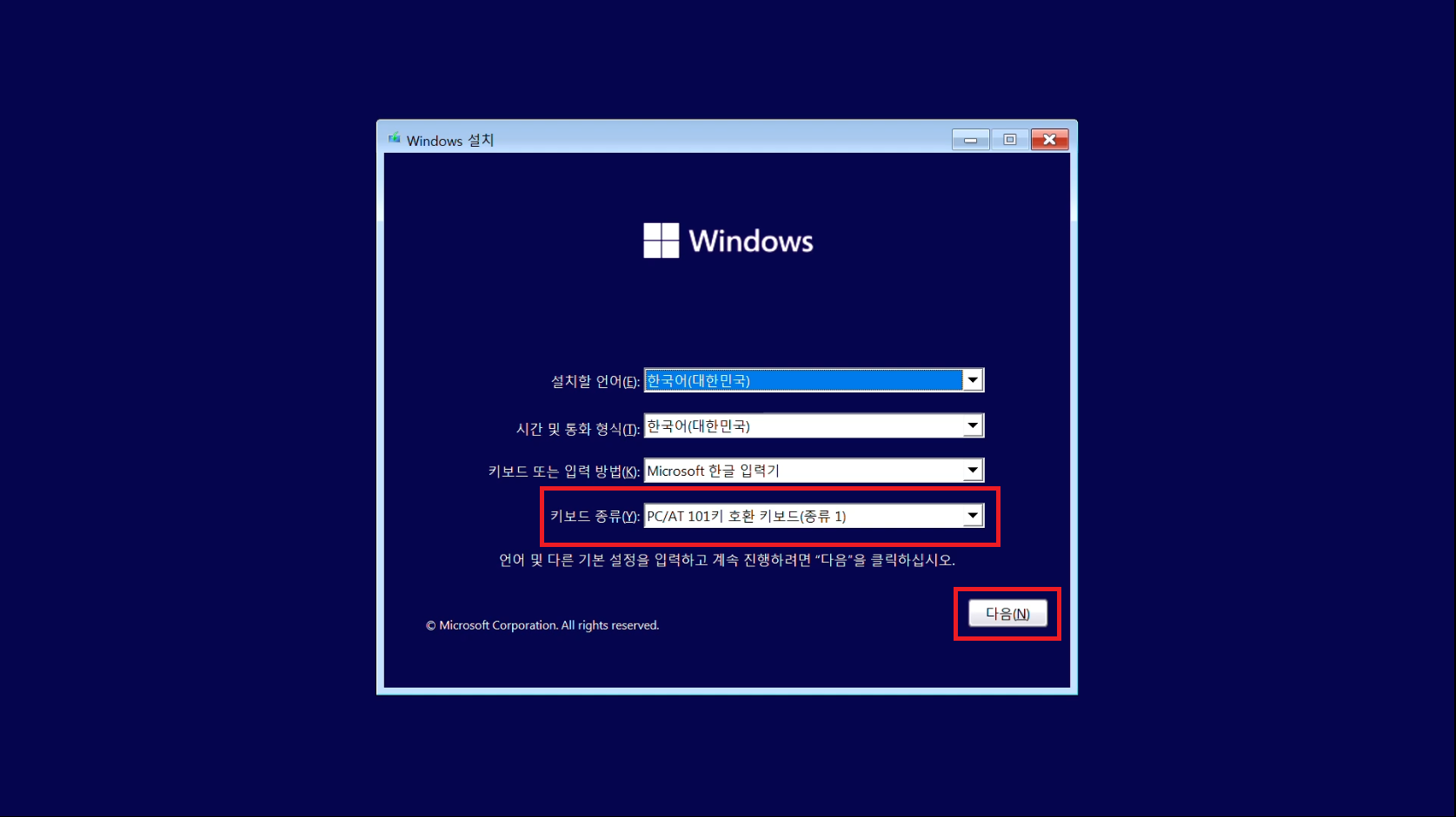 언어 및 키보드 설정이 완료되었다면 다음을 눌러주세요.
