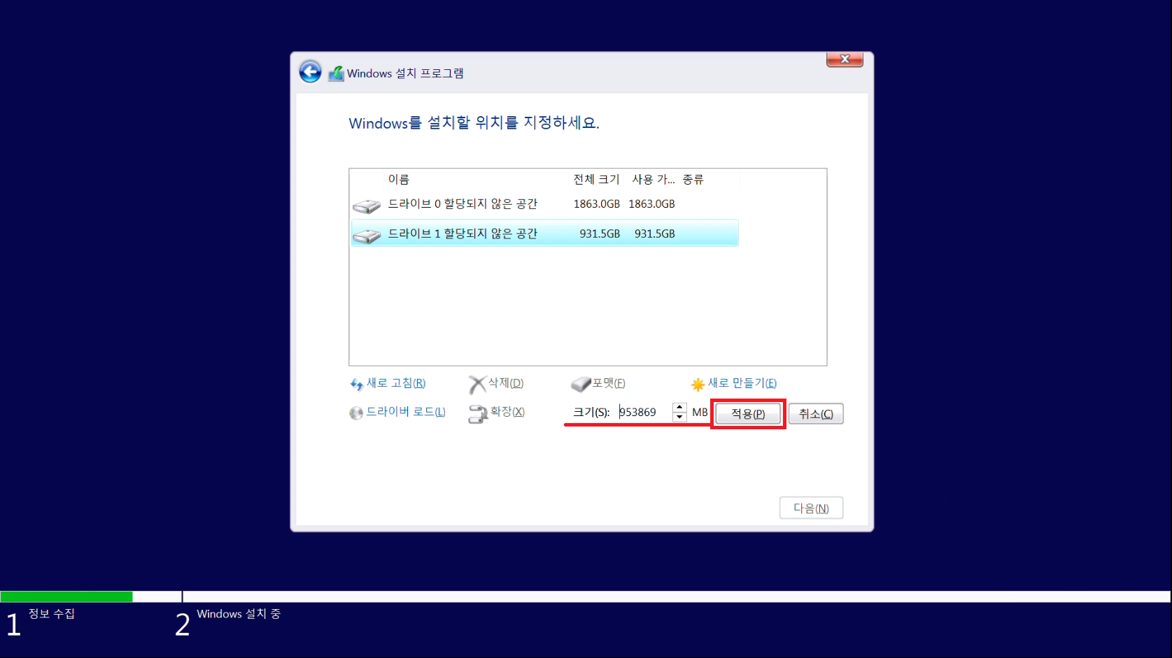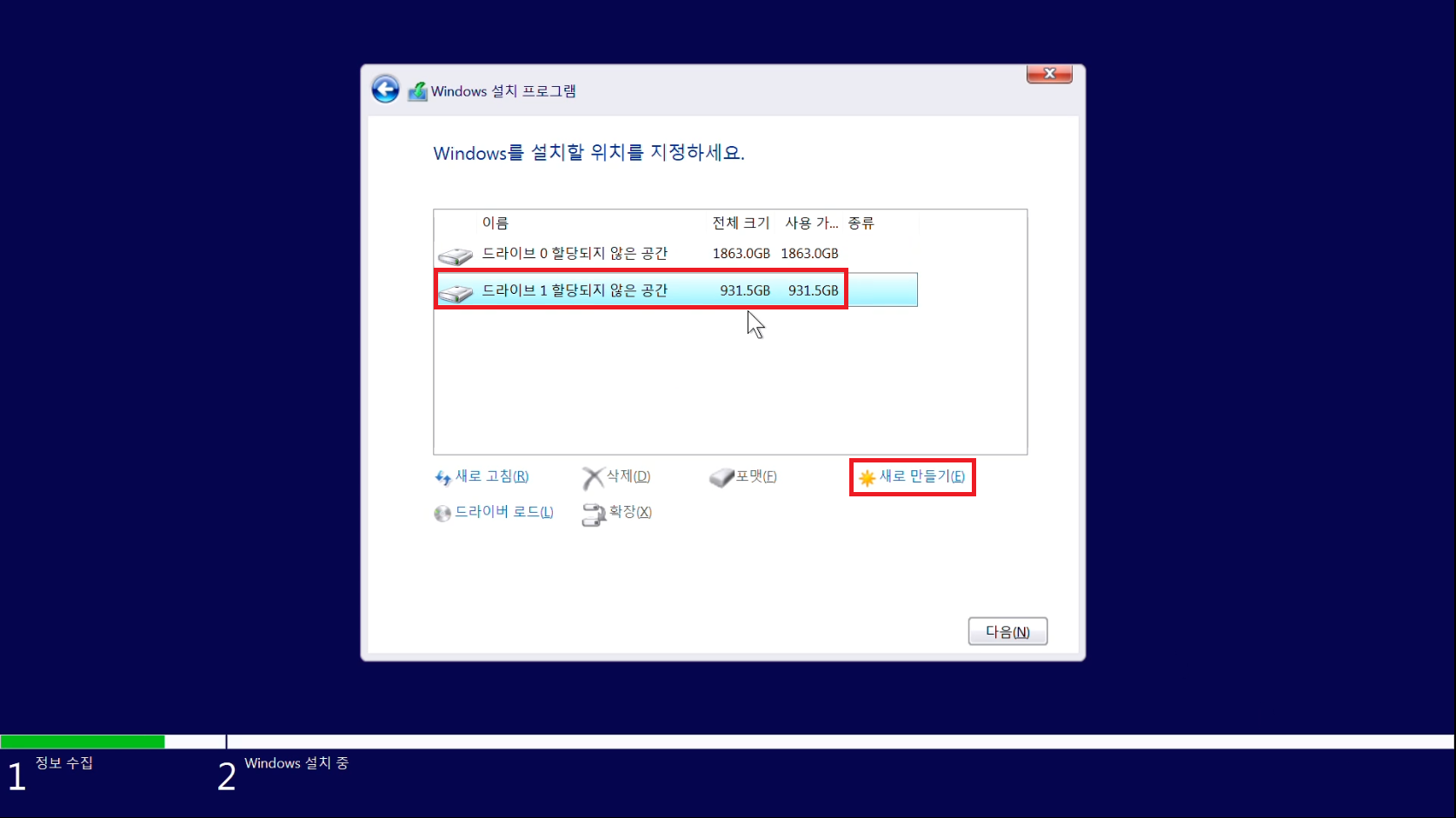 931GB 선택 후 새로 만들기를 눌러줍시다.