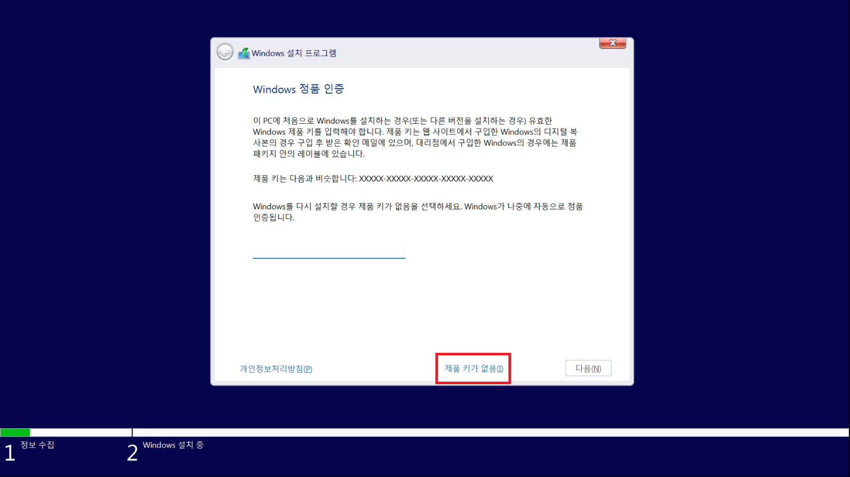 키가 없다면 제품 키가 없음을 선택해줍시다.