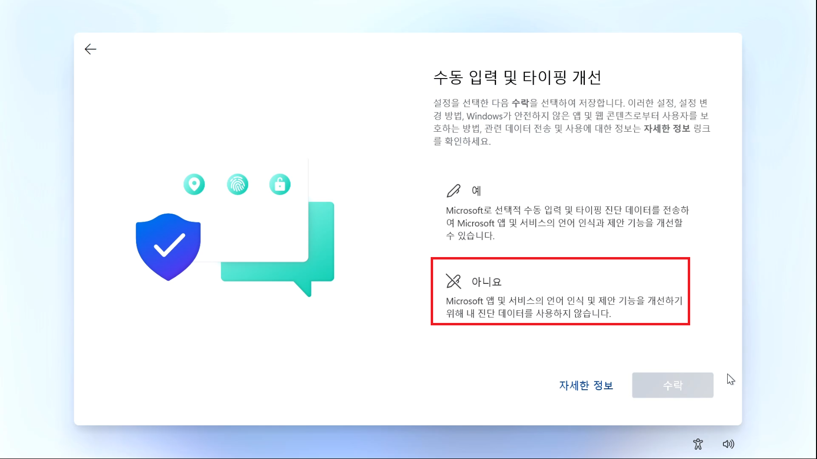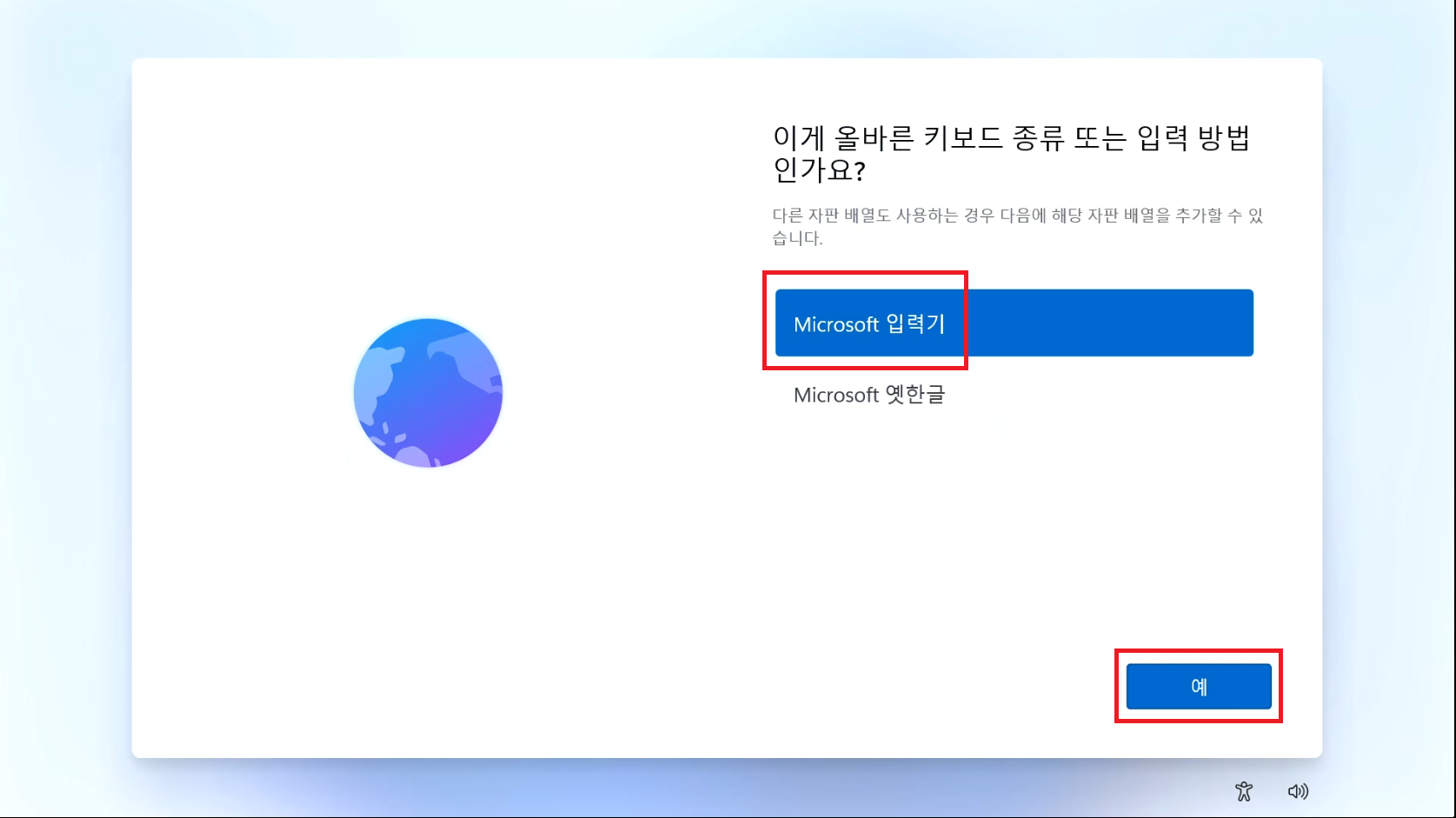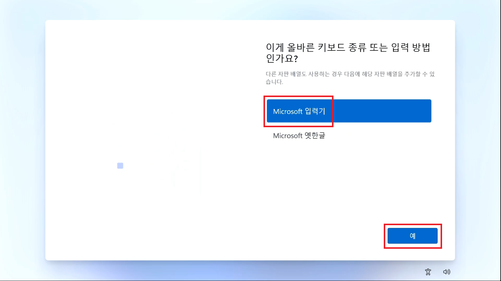 Microsoft 입력기를 선택하고 예를 눌러주세요.