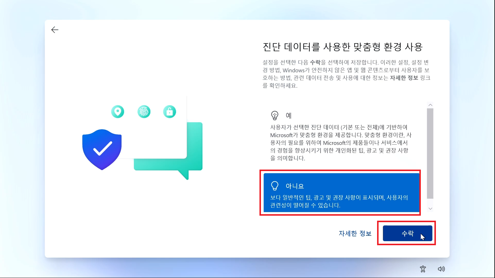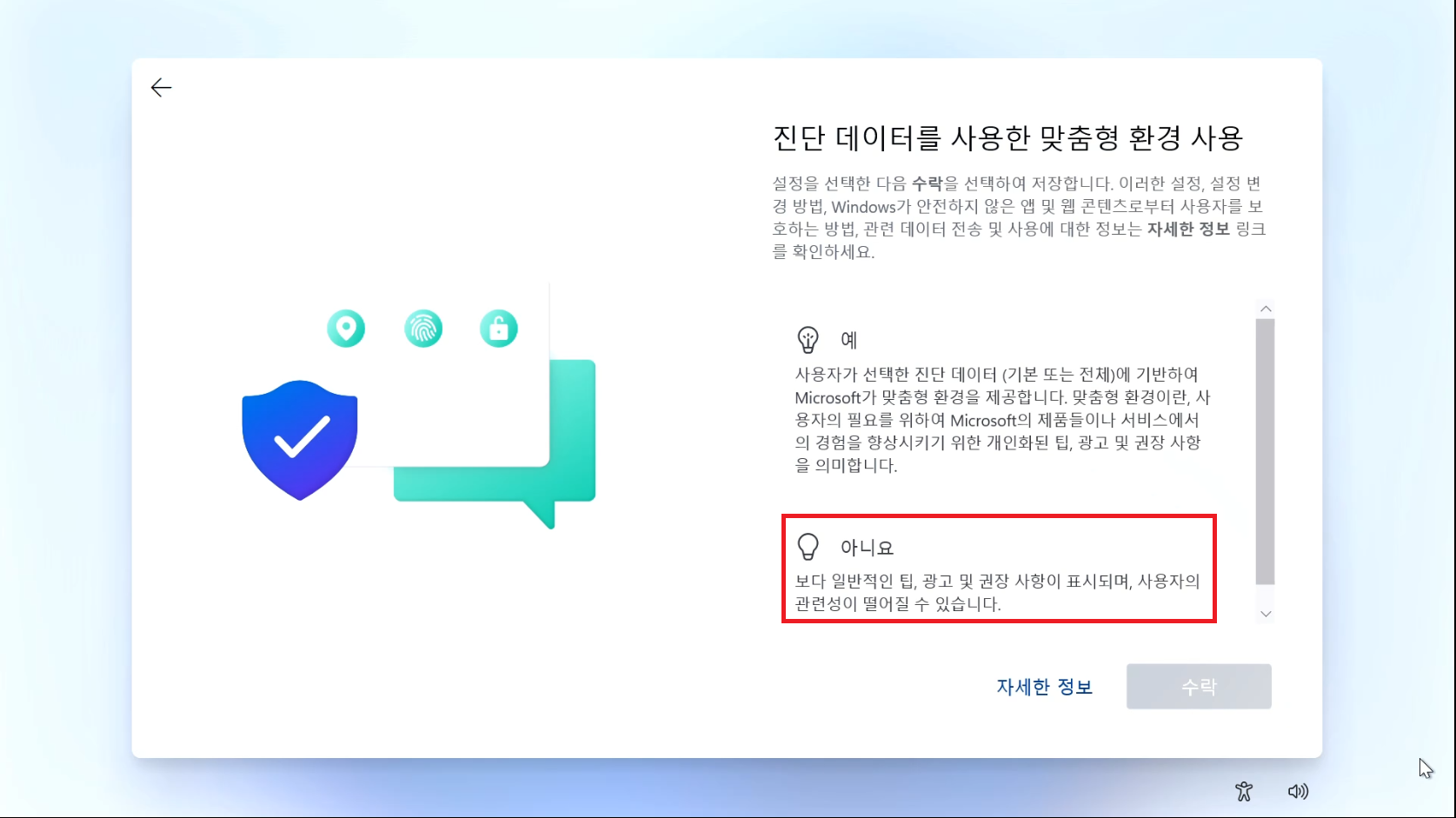 44. 진단 데이터를 사용한 맞춤형 환경 사용할건지 선택창입니다