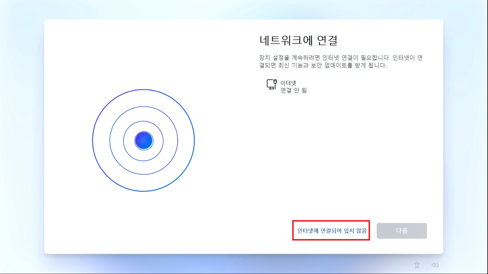 이 화면이 뜨기 전에 랜선이 뽑혀있으셔야하고 만약 랜선이 꼽혀있다면 마이크로소프트 계정 넣는 창으로 넘어가졌을겁니다.