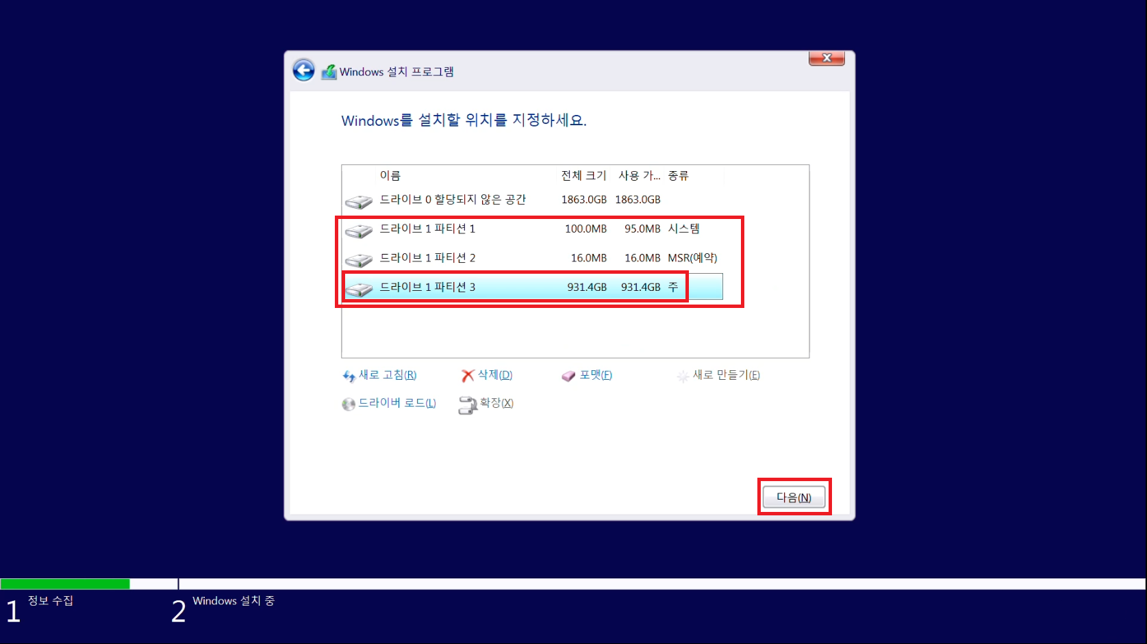 설치할 파티션을 선택하셨다면 다음 버튼을 눌러주세요.