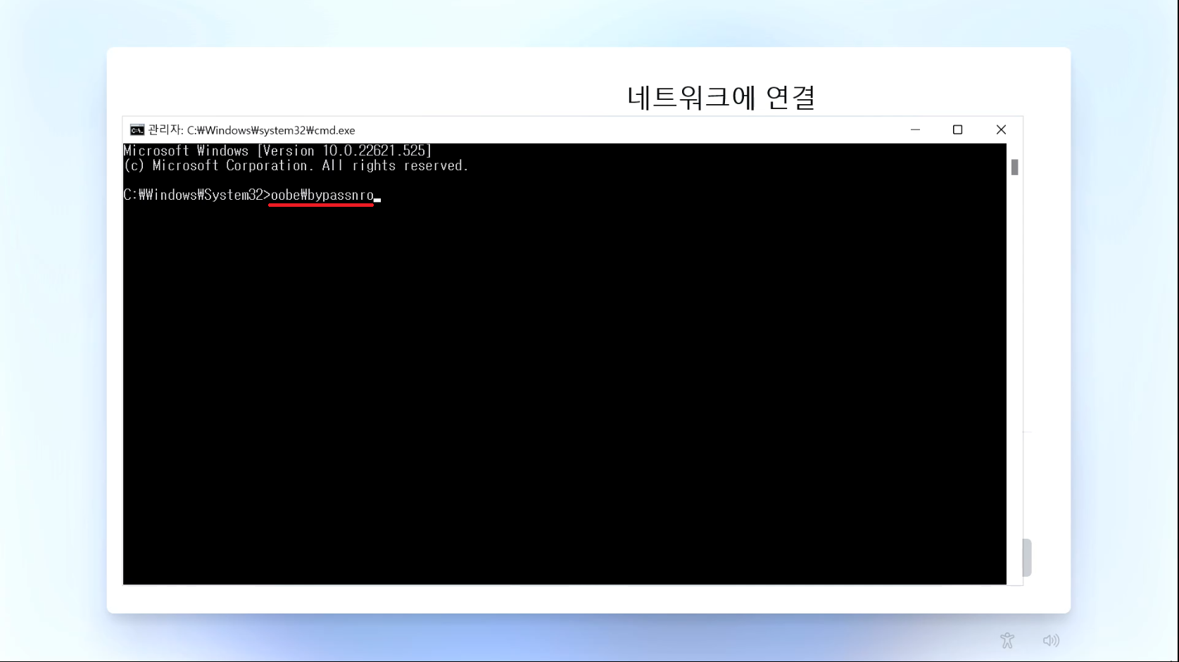 25. oobe\bypassnro 를 입력하고 엔터키를 눌러줍시다.