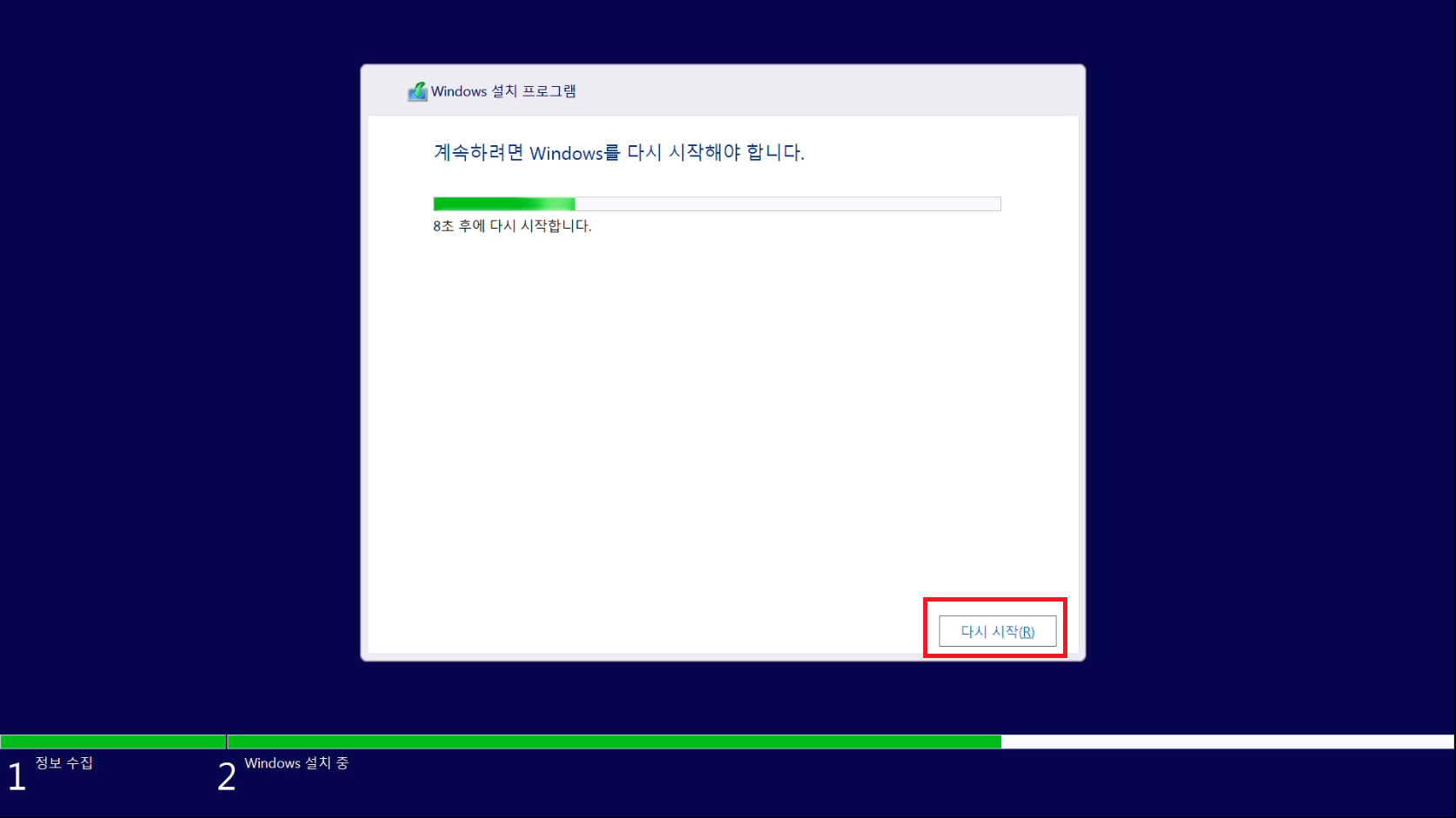 다시 시작할때 설치 USB는 컴퓨터에서 빼주시기 바랍니다.