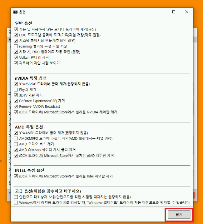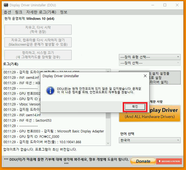 16. 안전모드에서 DDU를 실행 안 하면 위와 같은 메시지가 뜹니다.