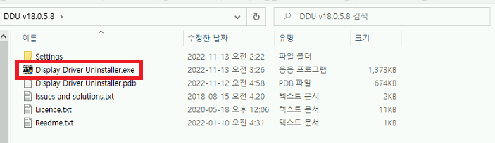10. DDU 압축이 풀리면 위와 같이 DDU v18.0.5.8 폴더가 생기셨을 겁니다.