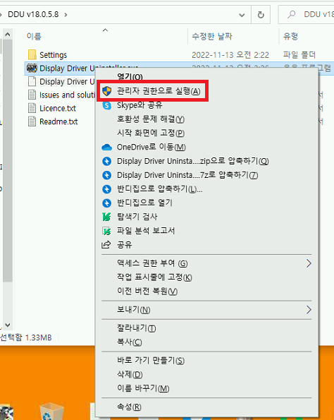 12. Display Driver Uninstaller.exe 를 마우스 우클릭하여 관리자 권한으로 실행합시다.