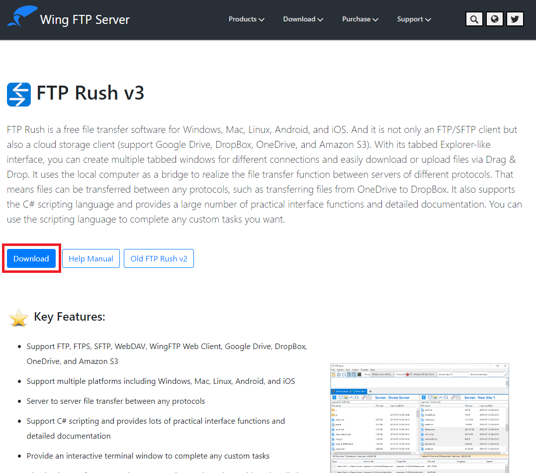 FTP Rush v3 FTP Rush is a free file transfer software for Windows, Mac, Linux, Android, and iOS. And it is not only an FTP/SFTP client but also a cloud storage client (support Google Drive, DropBox, OneDrive, and Amazon S3). With its tabbed Explorer-like i