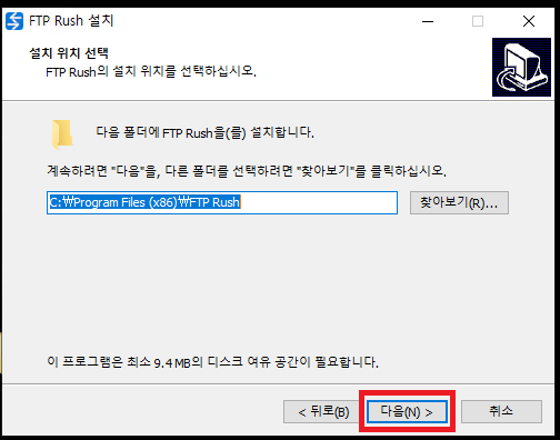 8. FTP Rush가 설치될 위치를 지정하고 다음 버튼을 눌러줍시다.