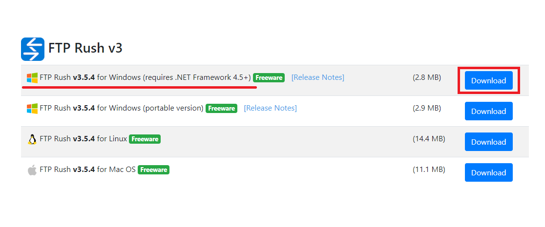3. FTPRush v3 다운로드 페이지로 들어가지면 운영체제에 맞는 버전을 다운로드 받을 수 있습니다.