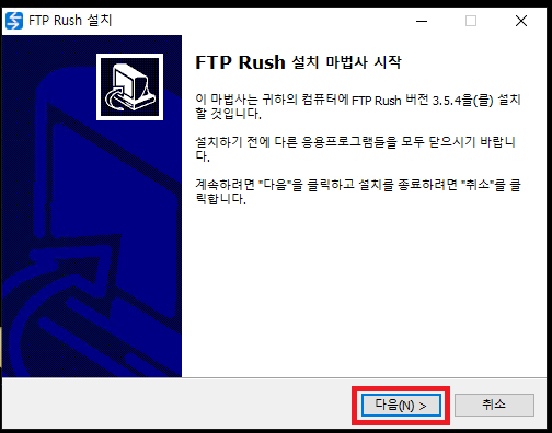 7. FTPRush 설치 창이 뜨면 다음을 눌러 설치를 진행해줍시다.